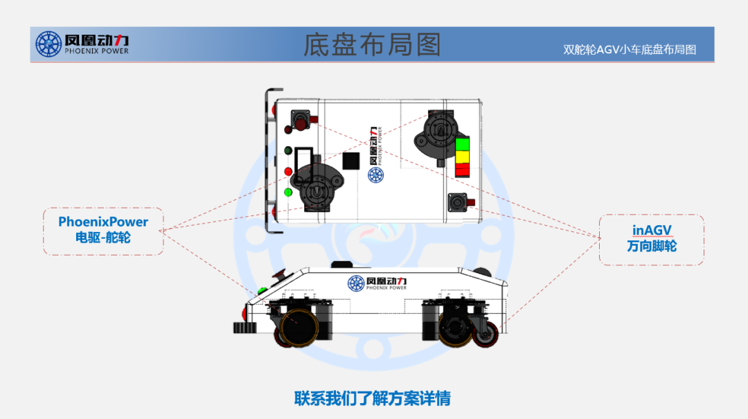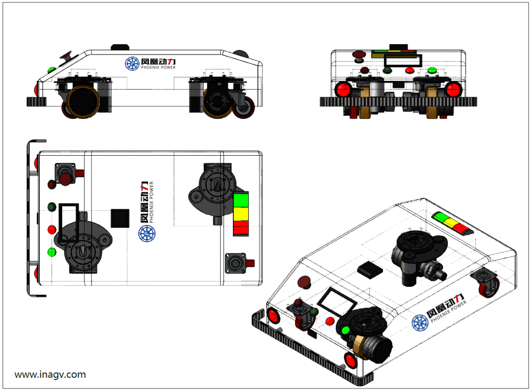 双舵轮AGV移动机器人意指一台AGV小车配置两台【凤凰动力】电驱动-舵轮,配置两只inAGV辅助从动轮(三轮结构)或四只辅助轮(六轮结构)。