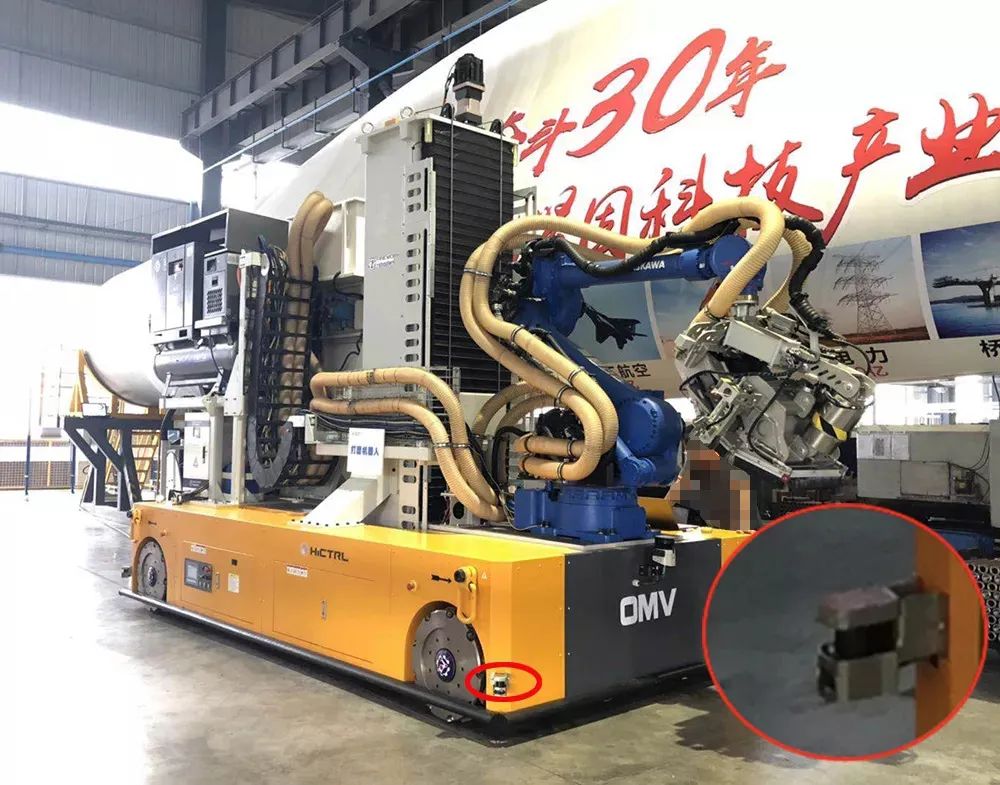 激光导航OMV装备有四个避障传感器,每个传感器的扫描范围为270°,检测距离1m。在车头、车的两侧装有柔性安全触边防撞系统。此系统可以监控在行进路程中OMV和其他物体之间可能的碰撞,发生碰撞后立即停止机器人/打磨头和OMV的移动功能并声光报警。