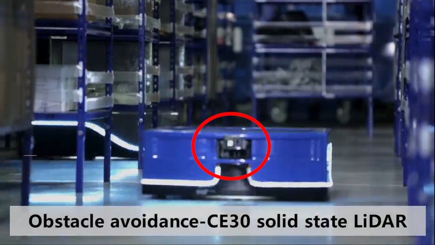 将一个CE30激光雷达安装在仓储AGV的正前方,实时监测前方障碍物,控制AGV减速或刹车,辅助其快速存取货、智能搬运等功能。