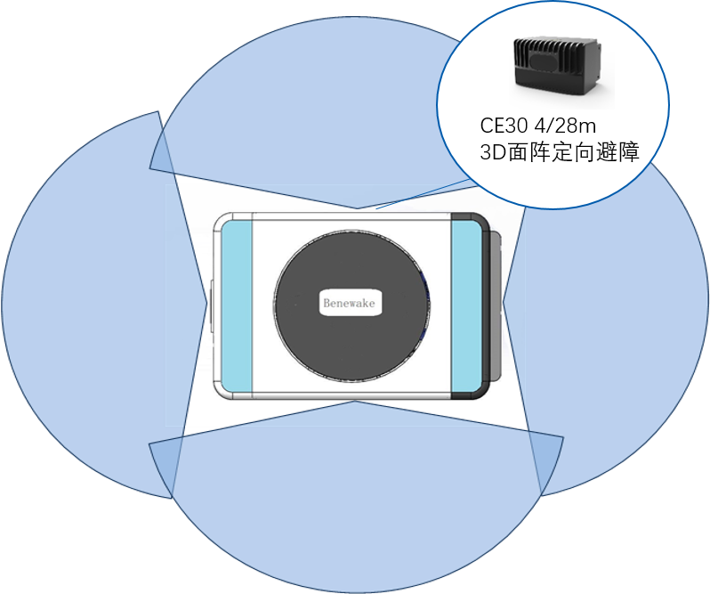 北醒CE30 3D面阵固态激光雷达也是一种定向避障方式,不同于单线及多线扫描避障方式。我们熟知的单线和多线旋转雷达均安装于AGV顶端,实现360°或特定角度避障,而CE30通过发射一束椭圆锥形光束,探测出固定视线范围内的障碍物信息,是低矮水平面且固定路径导航AGV避障的首选低成本方案。
