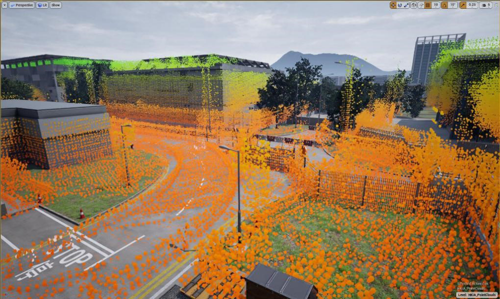 在完成所有的场景模型制作后,便进入场景整合阶段。我们将三维点云数据导入到UE4中,这是辅助我们对现实场景作“1:1”高精度还原的关键。最后,我们还会根据项目所在地的经纬坐标位置,实现不同时间下的光照模拟。