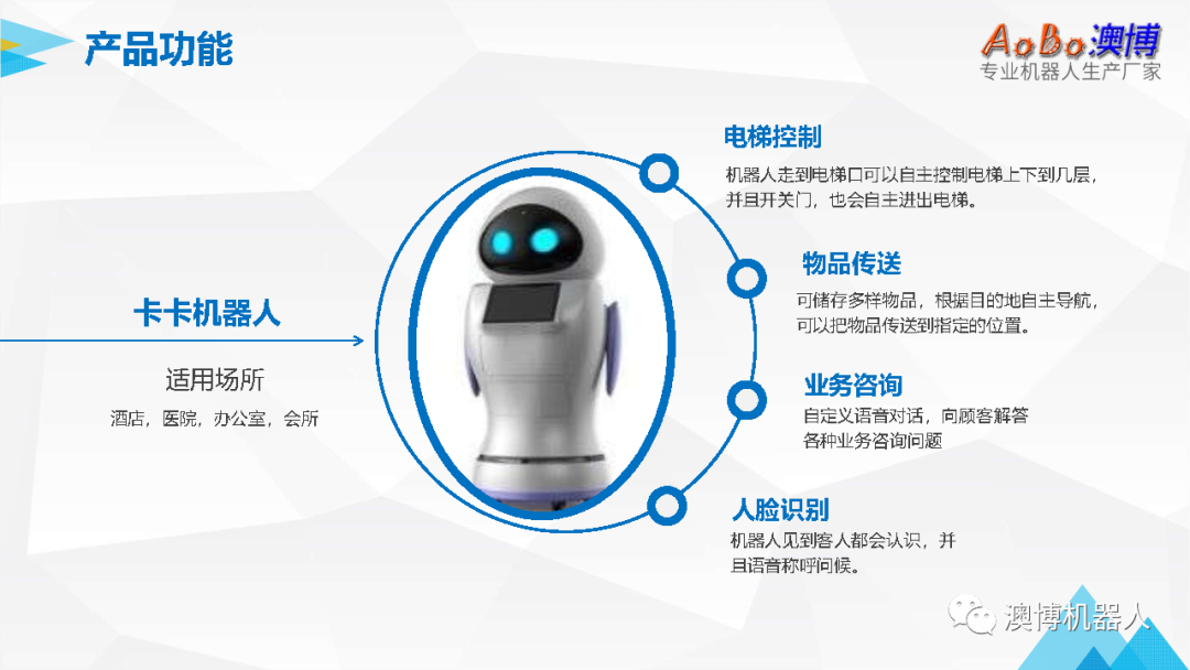 澳博机器人通过云端部署,以硬件+软件+云端的一体化开发,让产品快速接入服务场景。机器人一台上岗,全服上岗。接入卡卡机器人,将降低人力成本,解决末端配送难题。