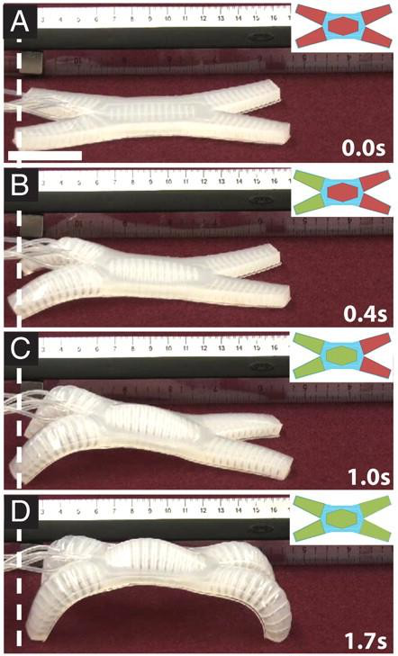 ■ 腔室在气体压力作用下膨胀。可伸展顶层和不可伸展底层之间的应变差异导致PN在加压时弯曲。我们通过其腔室的方向,尺寸和数量调整了PN的弯曲运动
