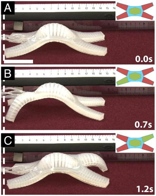 ■ 并研究蠕动、爬行两种运动方式,给出了在两种运动中软体机器人的腔室加压