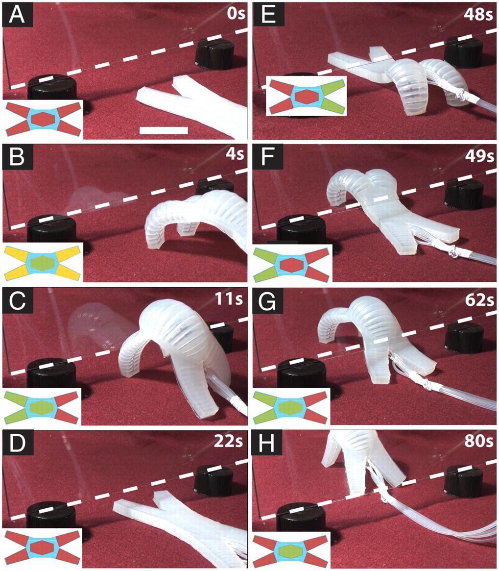 ■ 文章研发了一种具有多种运动方式的软体机器人,其主要的运动原理是通过伸展层中腔室的气压变化导致伸展层发生形变。并在抗拉伸层的共同作用下使软体机器人运动