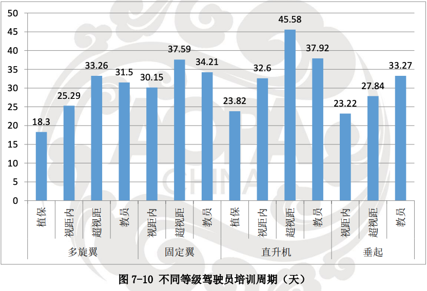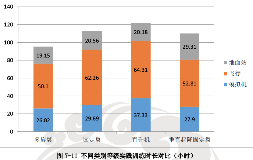 不同训练机构在软、硬件条件等各方面存在差异,包括:教学团队规模、飞行场地情况、教学容量、航空器保有量、训练质量和培训成本等。因此不同的训练机构会有不同的招生政策,各机构依据市场和培训成本自行定价。通过问卷调差,办公室收集了各个训练机构的培训周期情况,各机构理论教学时长平均值为47.61 小时,图 7-10 为不同等级驾驶员培训周期情况;图 7-11 为不同类别等级实践训练时长对比: