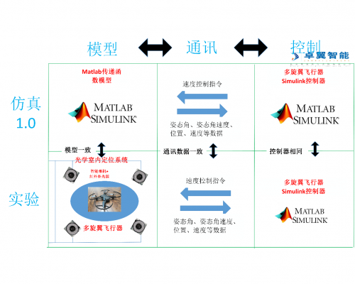 支持Matlab或ROS的地面控制站软件、室内定位软件:各一套,开源,可实时读取基于ROS的飞行场景仿真器、光学室内定位系统节点,读写真实多旋翼飞行器节点,能够在Matlab或ROS平台下统一地从仿真到真实实验,完成多旋翼飞行器的单机或多机协同控制。