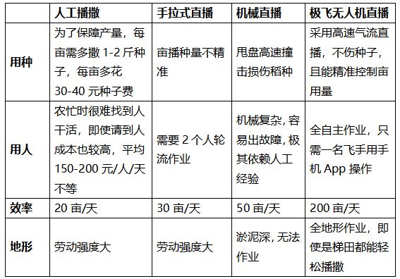 此外,对比人工播撒和传统农机直播,集施药、播种、撒肥等多功能于一体的极飞农业无人机,成本更低、效益更高,一套极飞智能播撒系统,每小时能够完成 80 余亩的水稻直播作业,相当于 50 ~ 60 个人工的效率。