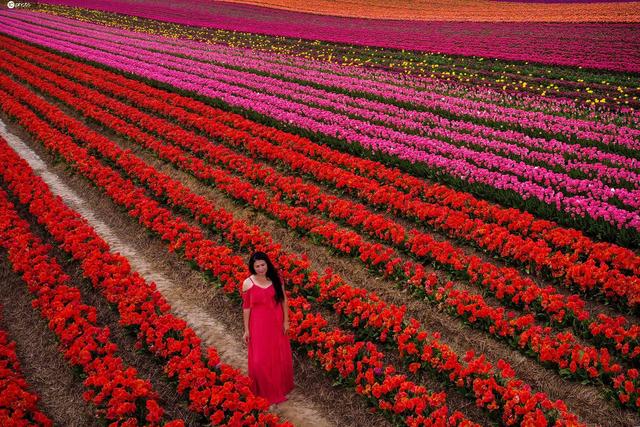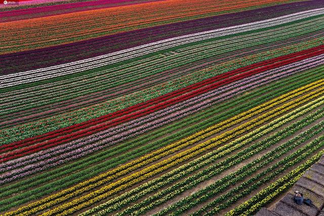 无人机航拍德国郁金香花海 呈现几何线条之美