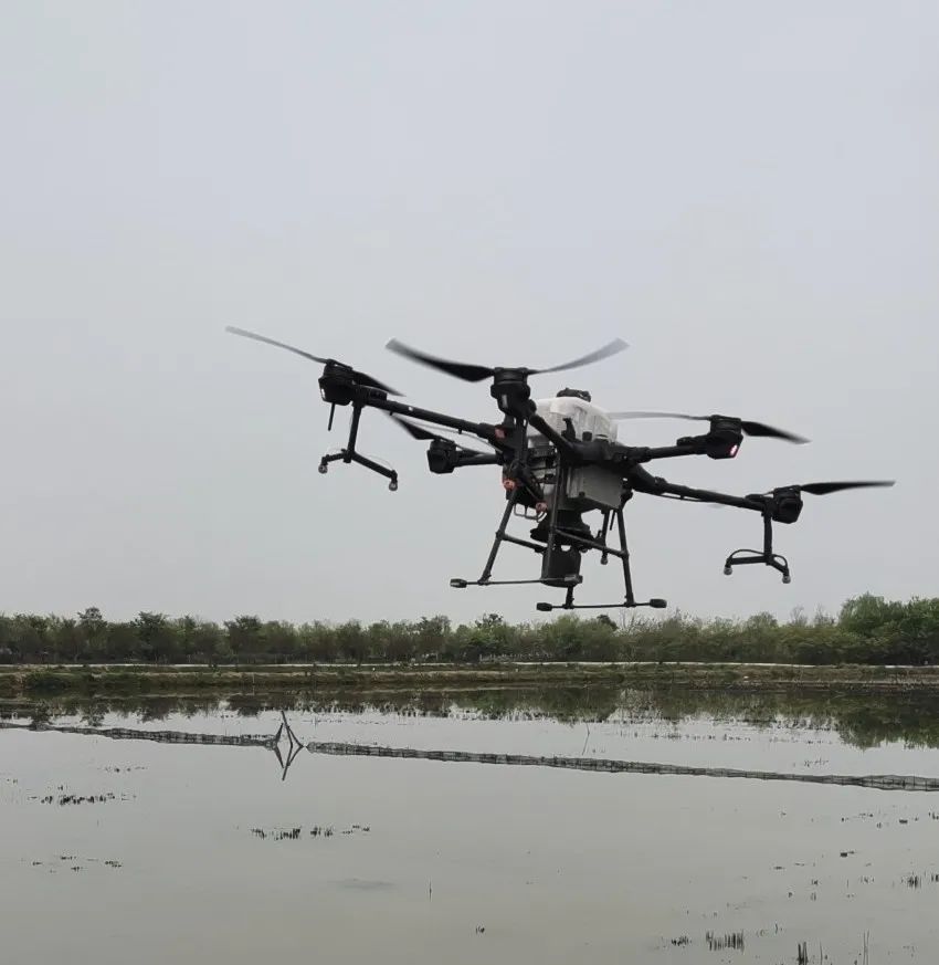 最近,他订购了一套播撒系统。经过培训,很快掌握了播撒机的使用方法。2020 年 3 月 8 日, T20 首次在南充的虾稻田上空起飞,均匀地撒下了一颗颗饲料, 100 亩虾稻田不到一个小时就撒完了。