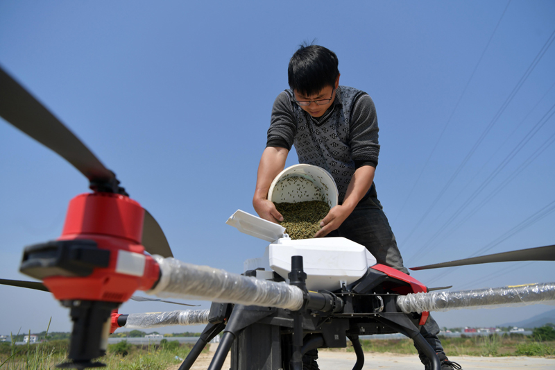4月16日,在江西省南昌市新建区石埠镇乌城村,当地农户将早稻种子倒入无人机的设备中,准备利用无人机进行播种。