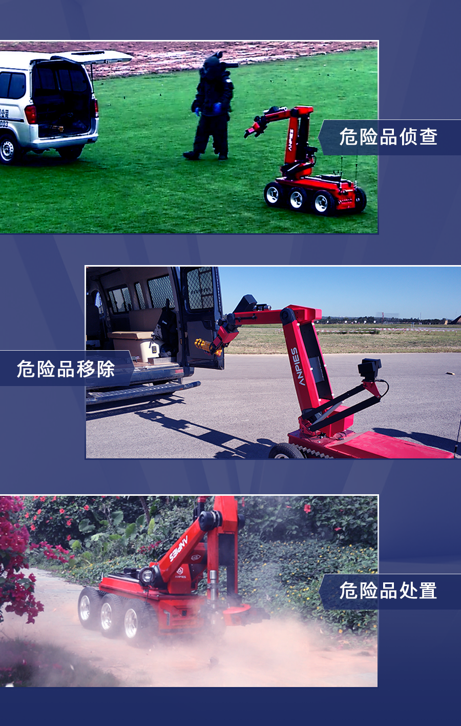 1、远程操控机器人进行危险物品勘查,如可疑物鉴别、探查、拾取、移除等。