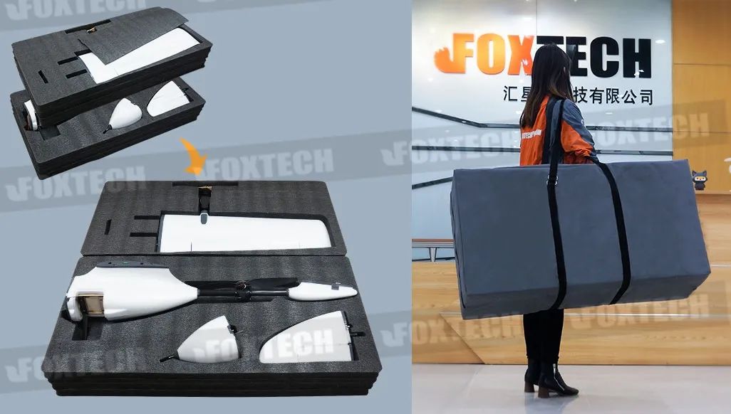 它采用固定翼结合倾转三旋翼的布局形式,兼具固定翼巡航远、速度高等特性,又具备旋翼无人机垂直起降对场地要求小的优势,很好的弥补了当时的市场空白。而且它采用模块化设计,拆装方便,用产品标准包装箱打包好后,女孩子也能轻松背起整个装置,非常灵活轻便。