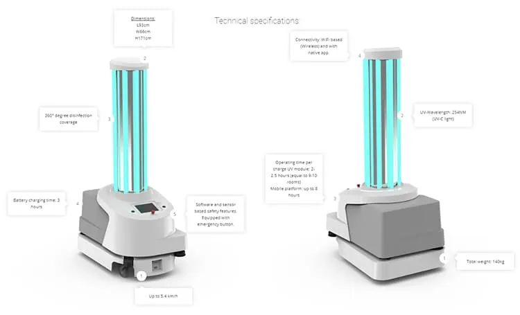 丹麦UVD Robots是另一家开发了抗菌消毒机器人的公司,该公司使用UV(紫外线)光杀死附着在物体表面的细菌和病毒。该公司由其母公司Blue Ocean Robotics于2016年成立。后者位于丹麦的欧登塞,已筹集了4,870万美元,其中包括2019年12月的1200万美元风险投资。UVD机器人使用LiDAR(激光雷达)绘制环境地图,使其能够在医院内自主移动,并可以在大约10到15分钟内,杀死光线能够照射到的物体表面上几乎所有的细菌和病毒。如果有人进入该区域,机器人甚至可以检测移动物体并关闭光束。
