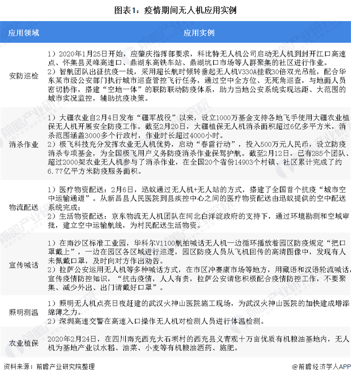2020年新冠疫情爆发,无人机作为智能无人化工作的代表,具有高效无休的工作能力、零接触的工作特点,成为阻断疫情传播的防控利器,在安防巡检、消杀作业、物流配送、宣传喊话、照明测温、农业植保等方面发挥了重要的作用。