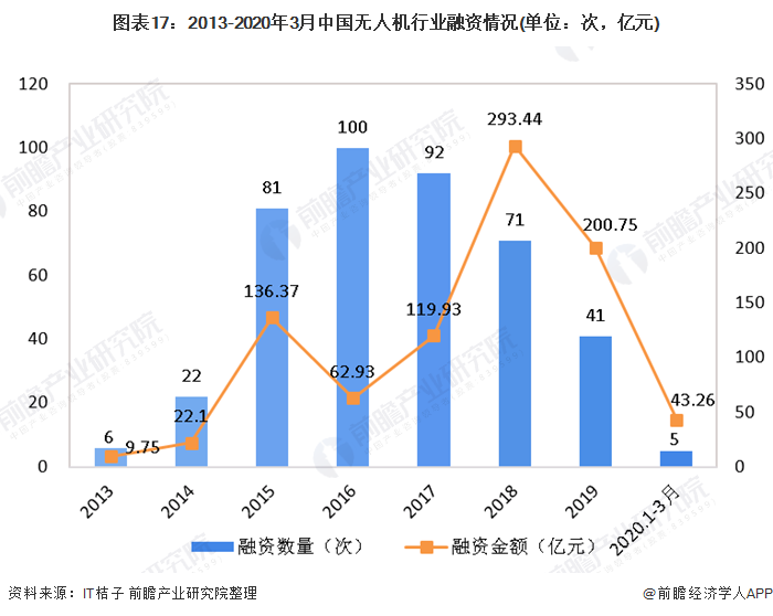 在资本的助推下,中国无人机行业发展如火如荼。2019年行业融资次数为41次,融资金额为200.75亿元,其中亿航智能于2019年12月12日在美国纳斯达克IPO上市,此次IPO融资金额为4000万美金,亿航也成为中国无人机行业第一股。2020年2月19日,中航金城无人机获得中航科工6658万元人民币的战略投资;2020年3月2日,微纳新空获得比邻创投领头的1亿元A+轮融资。前瞻产业研究院认为,未来我国无人机行业在政策和资本的双加持下,行业还将继续蓬勃发展。