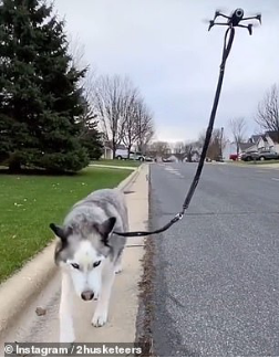哈士奇的牵引带挂在身后的无人机上,无人机发出的嗡嗡声示意狗狗可以出去散步了,无人机“遛狗”时,狗狗看起来很惬意,并没有注意到身后的无人机。