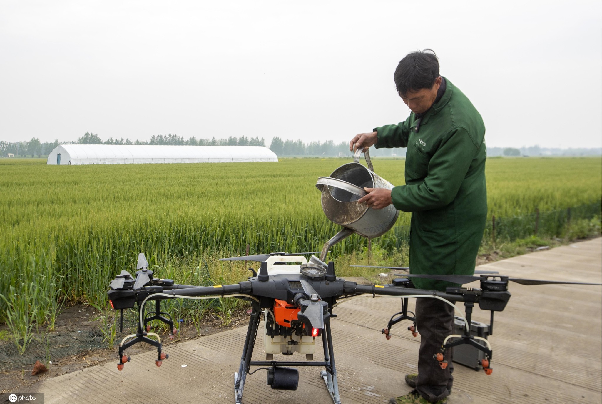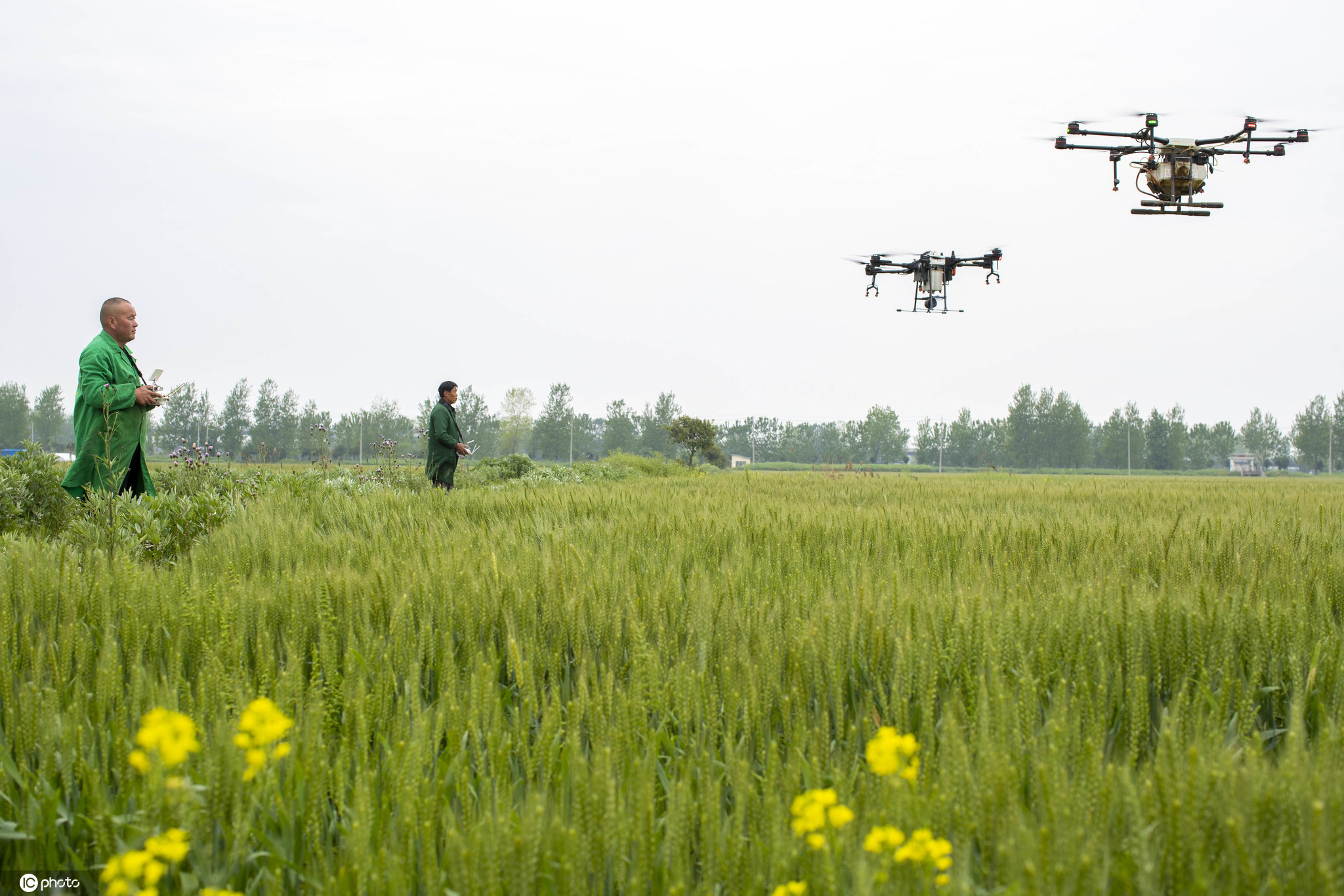 泰州市海陵区苏陈镇韩强农村专业合作社工作人员操作植保无人机对小麦进行“一喷三防”作业。