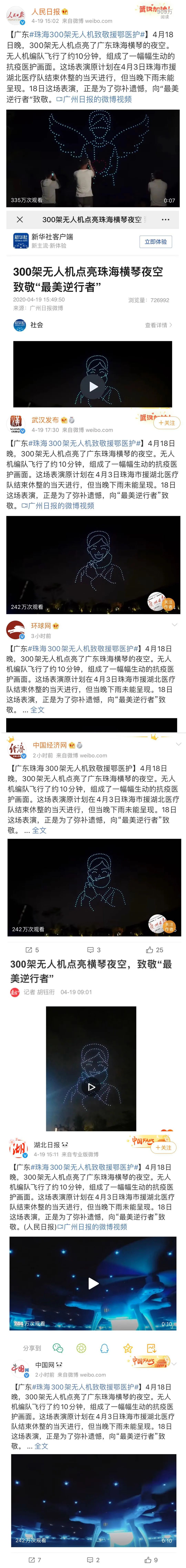 4月18日晚,深圳大漠大智控技术有限公司与珠海星乐度精心策划“爱在星乐度·2020再出发”为主题的无人机编队表演活动无人机编队飞行了约10分钟,展示了"逆行者""摘口罩""护士捧心"等9个精心设计的画面,并有微博、看点进行现场直播。