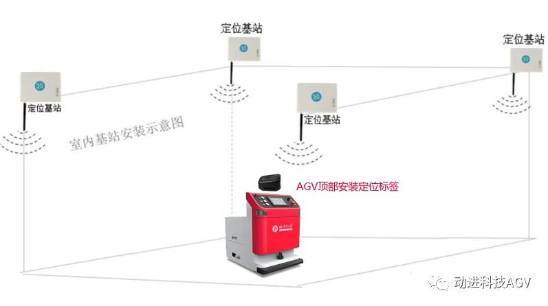 1、在AGV运动环境中安装一定数量的UWB定位基站,安装的原则是保证AGV小车在任何位置都可以看到至少3个定位基站,基站安装的高度不低于2米,保证基站和小车之间看得见;