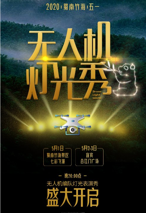 五月的蜀南竹海,夜空星光闪烁、竹影婆娑。5月1日晚8时许,数百台搭载高亮度LED灯的无人机将在蜀南竹海的著名景点“七彩飞瀑”腾空而起。它们将以天为幕,以竹为景,通过科技编排随着歌曲和灯光布阵交错起落,在天空中变幻出多个流光溢彩的图案和文字。或是竹波万里的生意盎然,或是熊猫吃笋的憨态可掬,或是酒都宜宾的源远流长,或是三江游船的悠闲惬意……这经典的一幕幕都将随着无人机队伍整齐划一的变幻,形成生动的VR画面,彷如璀璨星河点亮天际。