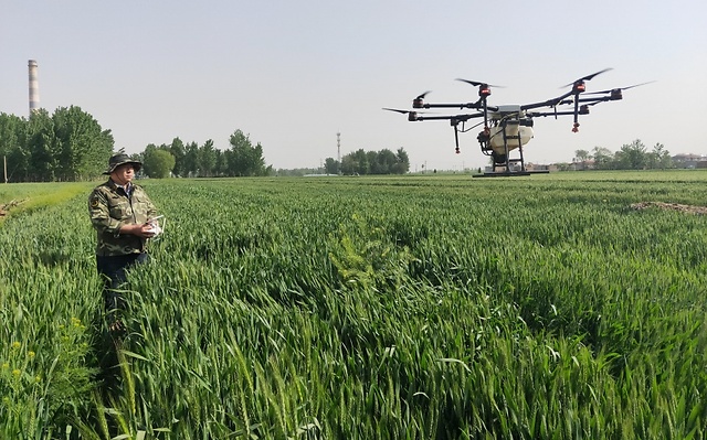河北省邢台市沙河市一望无际的麦田里,一架无人机正在麦田上空“劳作”,头戴遮阳帽的陈利杰熟练地操作着手中的遥控器。“无人机每天可以完成五六百亩地的农药喷洒工作,而人工的话可能只能完成20亩左右。”