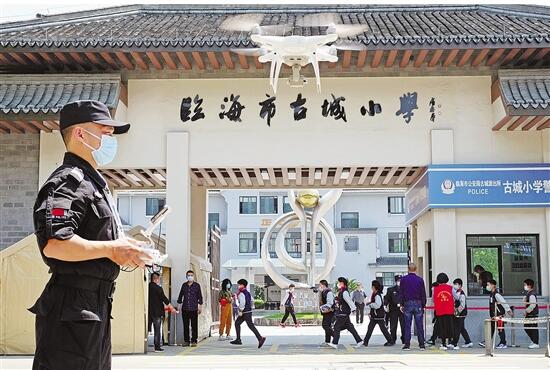 浙江在线4月29日讯眼下,临海市中小学生全面复课。临海市公安局古城派出所创新巡逻模式,利用无人机进行校园护学安保。图为4月27日,民警操作无人机从空中对学校周边的交通情况和治安情况进行巡查。