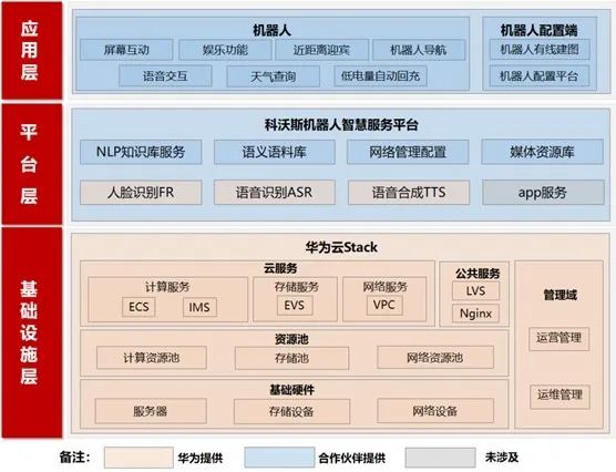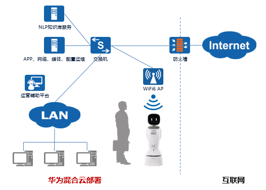 政务领域多为内网部署,科沃斯商用机器人通过内网本地化部署,NLP 、网络、媒体、配置、运营辅助平台等业务部署在华为混合云上,稳定可靠,保障业务永续。