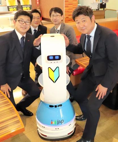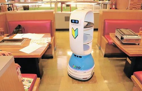 该店引进了两个机器人服务员,一台用于配膳一台用于收台。店员将料理放在托盘上,通过触摸屏操作指定座位,机器人即可移动到餐桌位置。机器人感知到食物被领取后移动到下一个座位。送餐途中人一站在面前挡路,它就露出为难的表情,并语音提示“请不要挡着我”,确认取餐后摸摸头就回厨房,让来店的客人开心。