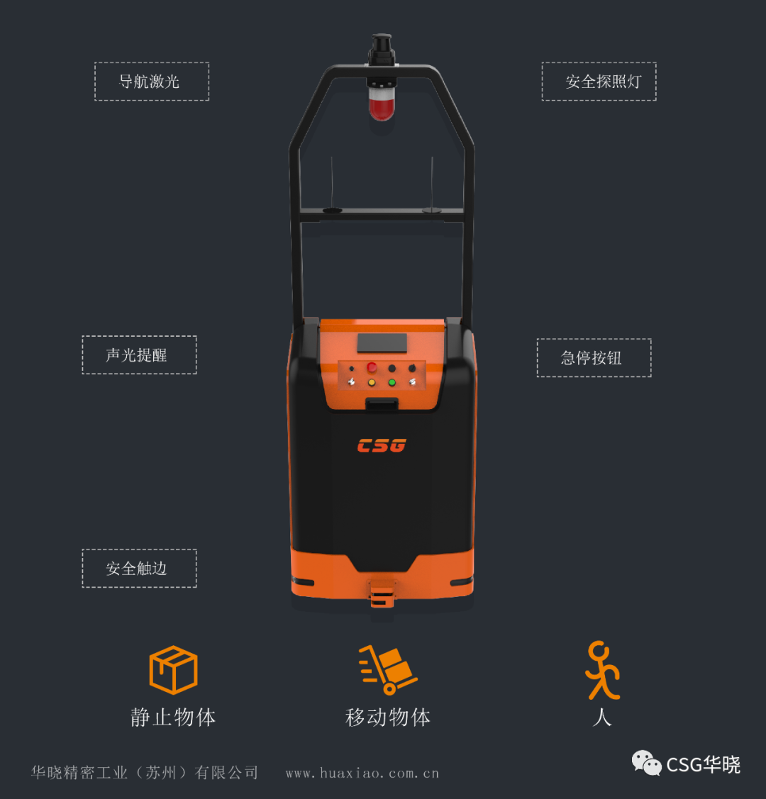 为降低AGV在作业过程中的风险,保证现场人员和货物的安全,华鹏W系舵轮式地牛叉车AGV搭载多级安全措施,支持多种传感器的安全防护,包括导航激光、安全探照灯、声光提醒、安全触边、急停等,可自主识别周围环境,有效避让静止物体、移动物体和人。