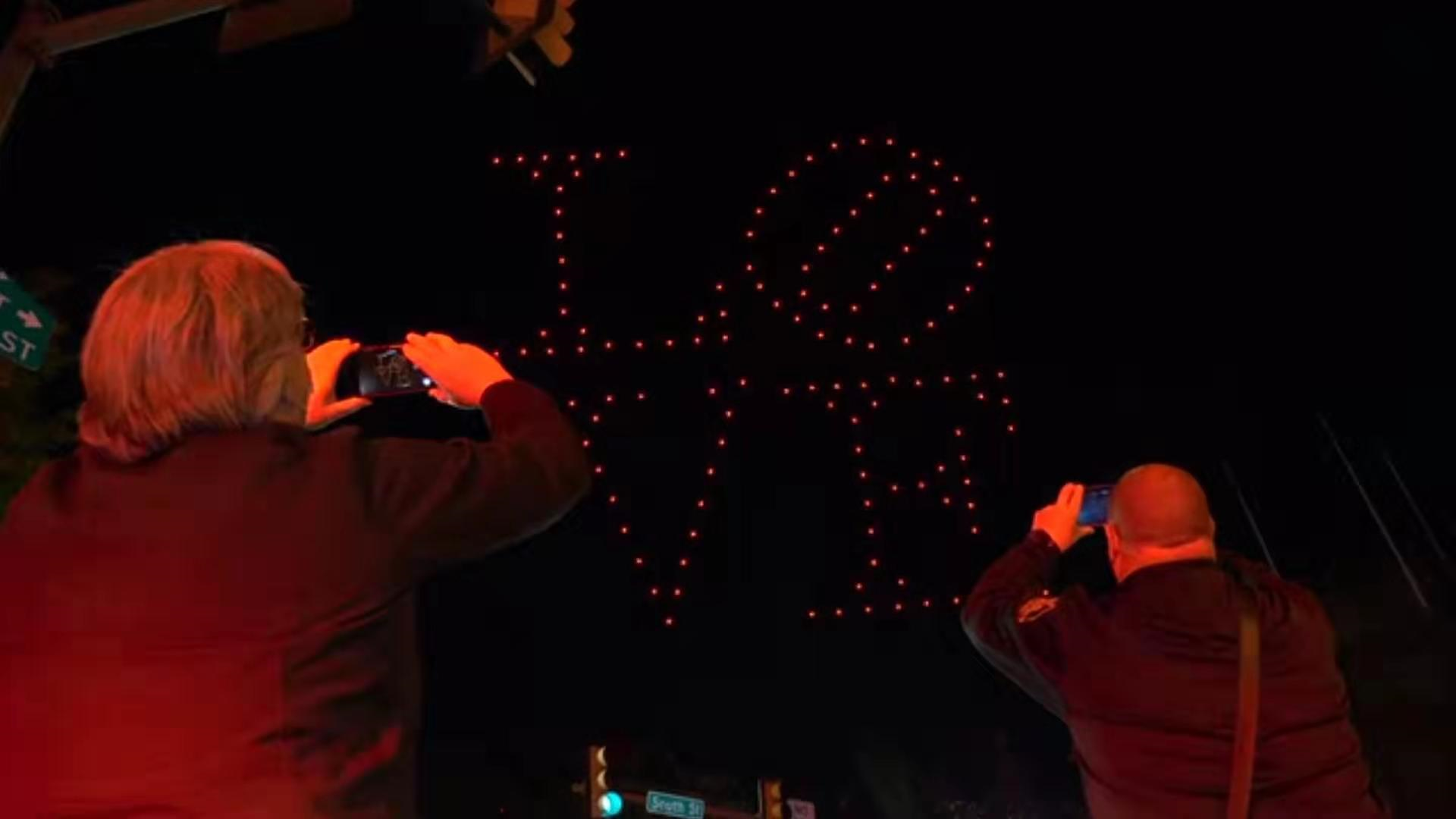 灯光秀是在费城富兰克林菲尔德足球场附近医院大楼发起的。大约140架极其明亮的无人机将自己配置成高达400英尺的巨型图像,使其在宾夕法尼亚大学校园和医疗中心以及费城市区的Schuylkill河对面都能看到。