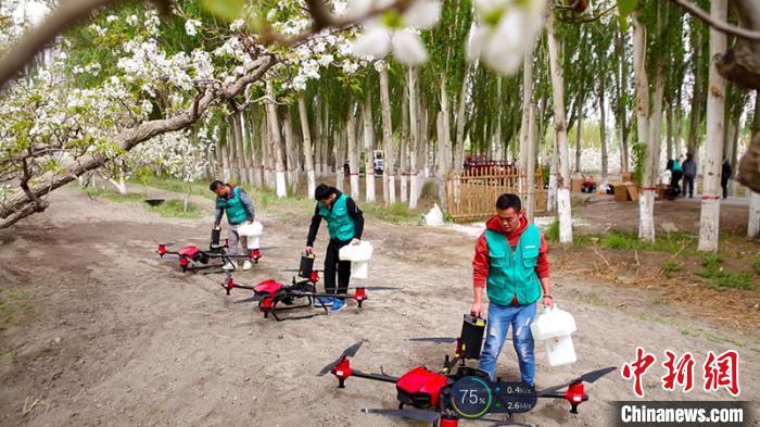 库尔勒市库尔楚园艺场已有4000多亩地采用无人机为梨花授粉。 甘明亮 摄