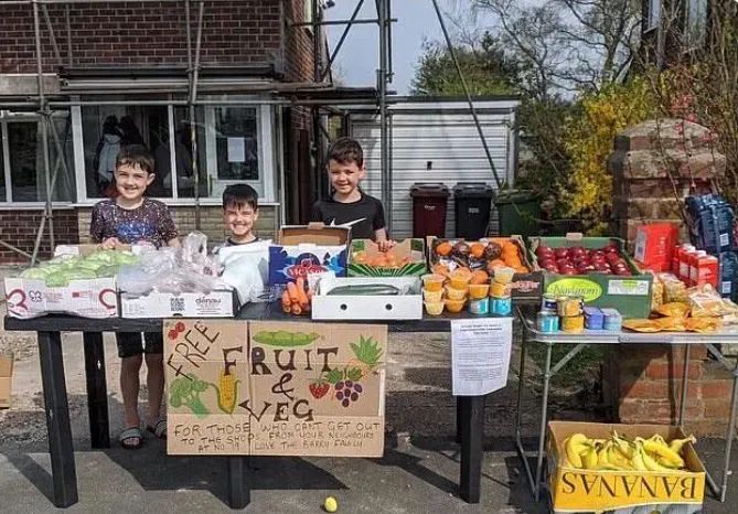 在英国曼切斯特,三名小男孩——9岁的约书亚、7岁的本和4岁的以撒成为社区的“小英雄”。三个孩子在自家花园前运营着一个蔬菜水果摊,为邻居中需要帮助的老人提供免费物资。