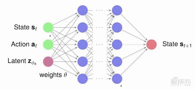 神经网络动力学预测模型以无人机当前的状态和动作作为输入。当无人机装载了有效载荷后,预测模型利用变分推断(variational inference)方法,根据当下有效载荷的质量、系绳的长度等状态参数快速推断出后验概率,帮助无人机适应新的飞行状态。