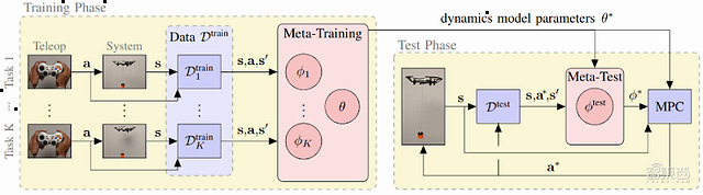 在模型训练阶段,研究人员手动驾驶载有不同有效载荷的无人机按照随机轨迹飞行,并收集这部分训练数据。然后,研究人员运行元学习方法,使模型学习共享的动力学模型参数和对不同有效载荷的适应参数。