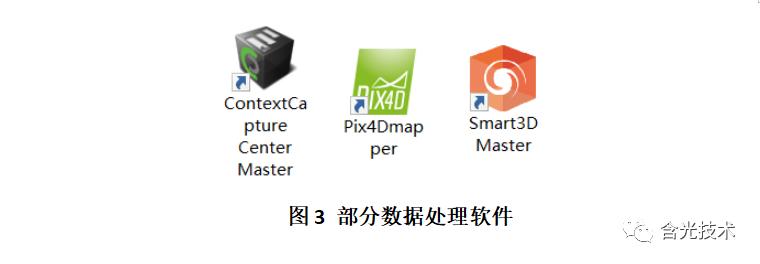 测绘技术的发展离不开计算机的发展,现代计算机强大的计算能力为摄影测量提供了可行性基础。无人机搭载云台(相机)采集到的影像数据通过空中三角测量及建模软件进行实体三维建模;目前用的最多最广的国外三维建模软件是美国bentley公司的Context Capture。其次是瑞士PX4D公司的Pix4Dmapper,AGISOFT 公司的photoscan,德国的inpho等。其中Pix4Dmapper、photoscan、inpho多用于进行正射模型处理,Context Capture多用于进行三维模型处理,三维模型成果下也可出正射模型。国内上海瞰景开发的Smart 3D实景三维建模软件,大疆创新也推出大疆智图等国内建模软件。部分数据处理软件如图3所示: