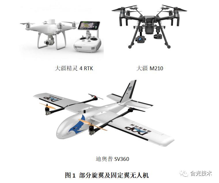 目前国内测绘无人机企业如雨后春笋般涌现,如大家熟悉的大疆精灵4RTK大疆M600 PRO、M210系列;迪奥普SV360系列无人机;飞马D200、V1000系列;成都纵横CW系列;科比特无人机等;如中海达、南方及上海华测导航等测绘仪器厂商也陆续推出自己的航测无人机产品;部分旋翼、固定翼无人机如图1所示: