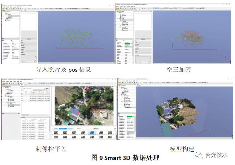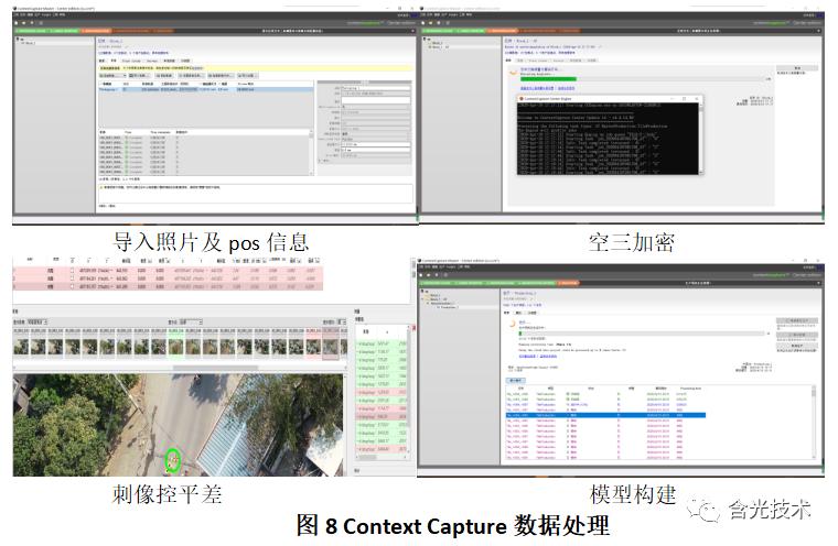 无人机航测数据及pos数据整理好后进行航测数据处理。内业数据处理主要分为四部分:1、照片及pos导入;2、空三加密;3、像控点平差;4、模型构建。以下以国外常用软件Context Capture及国产软件Smart 3D为例。如图8、图9所示: