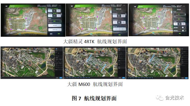 航线规划主要以能获取到满足测绘需求和建模标准的测区影像及坐标数据为目的。正射航线需囊括测区;倾斜航线需在囊括测区下外扩行高距离,以满足测区边缘建模效果。航线规划一般主要包括航线设置、航点设置、相机设置等。需确认测区航线分布、行高确认、重叠率确认、速度设置、确认各个拍摄点或转弯点的状况;相机设置需确认飞机天气情况及相机参数等。图7为大疆精灵RTK航线规划部分界面及大疆M600航线规划部分界面:
