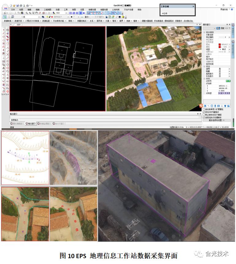 无人机航测数据通过处理得到带精确坐标的三维模型或DOM/DSM/DEM等数据,模型数据导入数据采集软件进行我们需求的测绘数据采集。通过在计算机上使用相应软件可采集到模型内任意所需求的坐标数据:如房地一体、道路交通、地形地貌、河湖条带、土方计算等;如图10为北京山维科技EPS地理信息工作站数据采集界面: