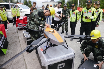 图为该队展示的是多平台激光雷达测量系统。这种无人机价值200多万元,最高时速50千米,一个架次就可以测绘比例尺1:1000的地图面积1平方公里。还能自动滤除植被,实时绘制3D立体地图,主要应用在国土调查、地质灾害调查、环境保护等诸多领域。