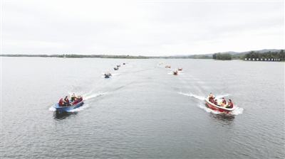 “受连续暴雨影响,三岔湖周边出现险情!”演练现场,模拟出群众被困情景。抢险队员集结完毕,便立即到达指定水域。根据现场指挥部命令,12艘冲锋舟组成两路纵队出发进行水面搜救,在行进中逐步演变为水面搜救队形,同时派出无人机侦察人员被困和物资受损险情。