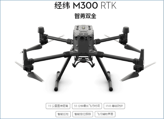 经纬 M300 RTK也就是大疆最新发布的行业无人机,除了优秀的飞行性能以外,可以实现同时支持三个负载:上置单云台+下置双云台。采用的全新 OcuSync 行业版图传系统,可以实现远达 15 公里的控制距离和三通道1080p图传,可以应用于电力油气巡检、消防、应急搜救、警用执法等场景。