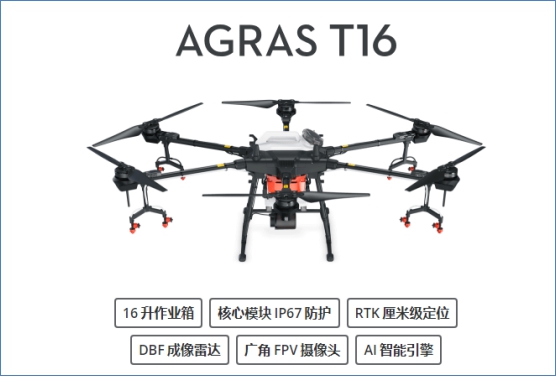 一年后大疆又发布了农业应用的第二款无人机Agras T16。Agras T16性能比MG-1P更为夸张,同样的8轴旋翼,作业箱容积提升到了16L,每小时作业效率更是提升到了150亩,并且增加了MG-1P需要增配的RTK模块和电磁流量计。