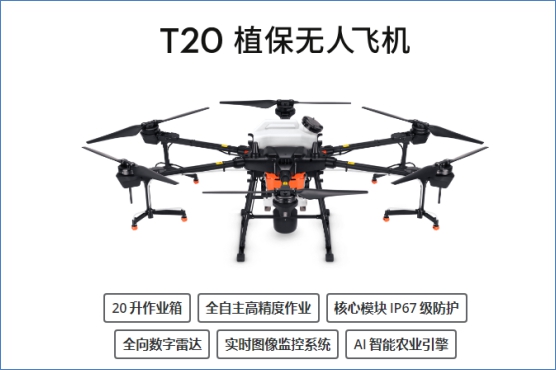 之后19年底发布了升级版Agras T20。看型号就知道了,在T16的基础上将作业箱容积提升到了20L,每小时作业也提升至180亩,电磁流量计改为了四通道,还支持一键排除管道空气,并且支持草原补播、固体肥料播撒、虾稻田饲料等播撒作业。一机多用,性能无敌了。