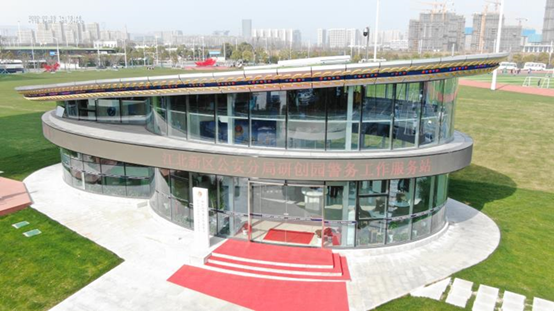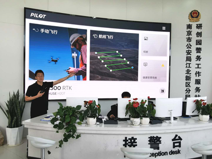 江北新区研创园警务站位于江北新区研创园园创路,外观形似一顶警察大檐帽。以服务园区高新技术产业为主,兼具园区应急处突、巡逻防控、打击现行、警情处置、服务群众、窗口宣传等职能。同时利用区域优势将高新技术发展融入警务工作中,进而谋求实实在在的警务效益,为园区未来警务工作治理体系和能力现代化打下坚实基础,建设具有显著园区属性的“全国一流、全省第一”的警务工作站,研创园警务站无人机分队充分发挥警务站无人机空中巡航优势,将无人机快速、远程遥控的优势运用到巡查工作中。