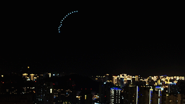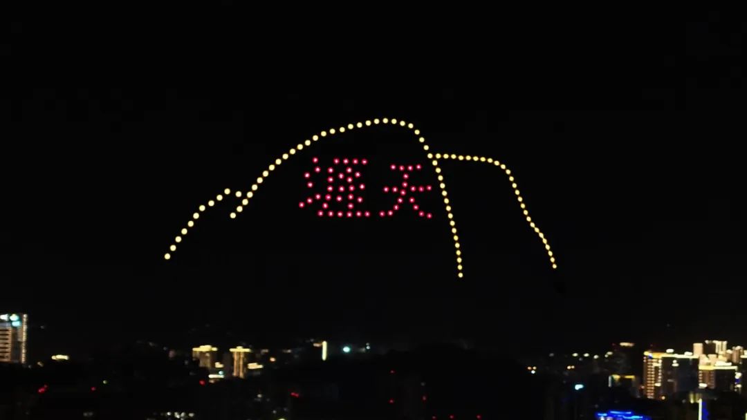 夕阳在天涯海角留下最后一抹余晖,夜色徐徐降临,300架无人机仿佛斑斓的七彩星光,带着对医护人员们最美好的祝福腾空而起。