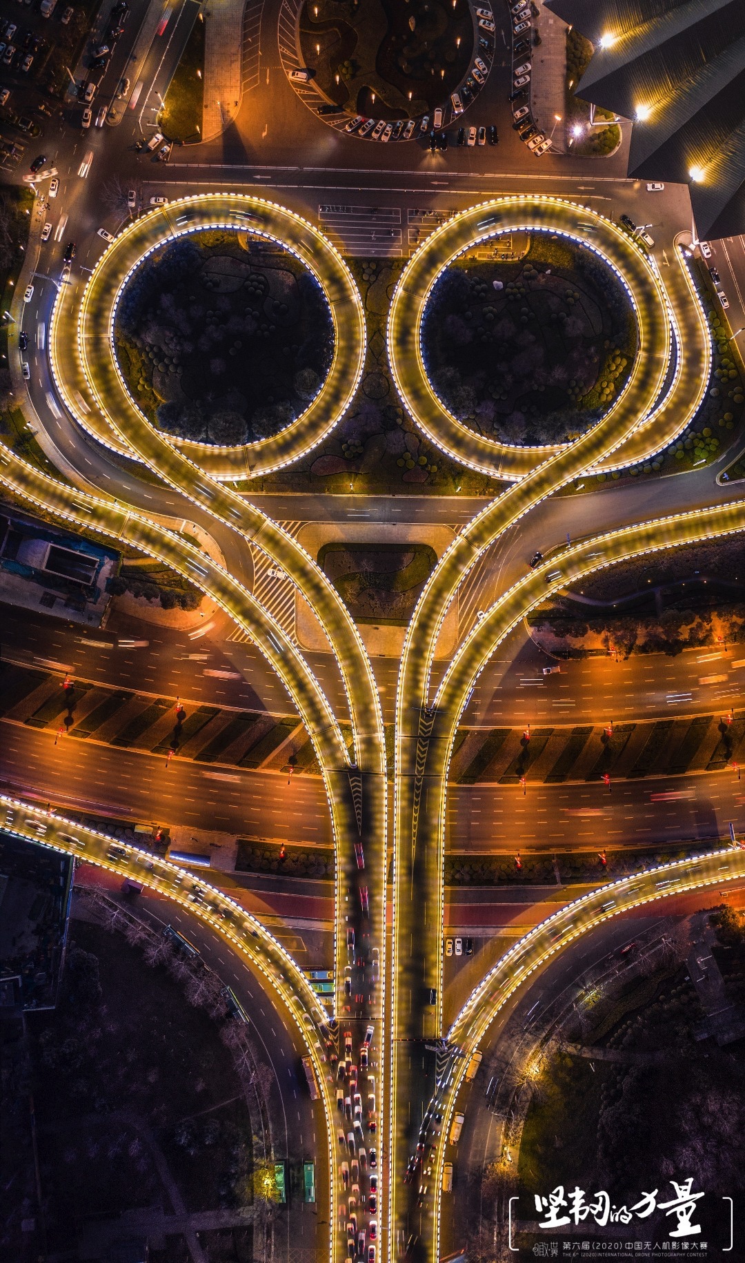 郑州绿地中心前的立交结构。夜灯亮起,彷佛外星人的眼睛。