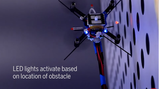 研究小组为一款只有手掌般大的无人机配置类似的传感器,并为其安装了当感测到障碍物表面时会发光的灯