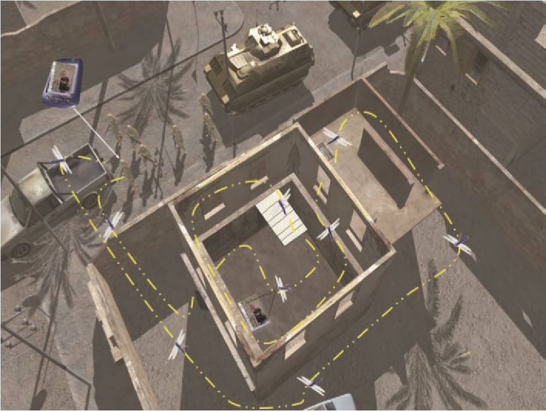 2017年1月,陆军发出信息请求(Request for Information,RFI),要求工业界和学术界提交与可作为单兵传感器(Soldier-Borne Sensors,SBS)的超小型(纳米)便携式无人驾驶飞行器相关的信息,用于收集ISR数据,希望纳米无人机可由小型手持或士兵佩戴的形式使用,在士兵进入建筑物之前使用纳米无人机探测建筑物内部,如图3所示。通过这个SBS项目,陆军目前正在评估这类应用的各种解决方案。要求包括150克(约5盎司)的重量,15分钟的飞行时间,以及15节的抗风能力。